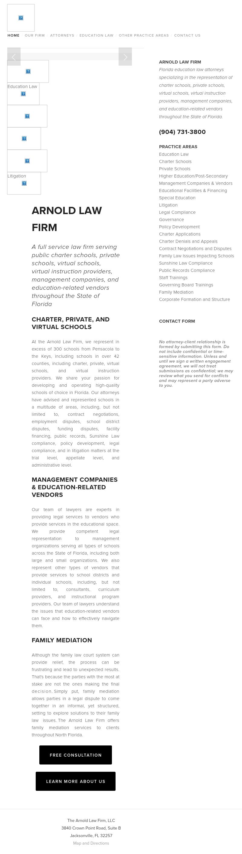 Arnold Law Firm Florida Education Law Lawyer | Jacksonville Public & Private Education Law Attorney | Miami Charter School Law Devoted educational law and governmental law counselors and attorneys throughout Florida. Call Arnold Law Firm today at 800-579-1019.