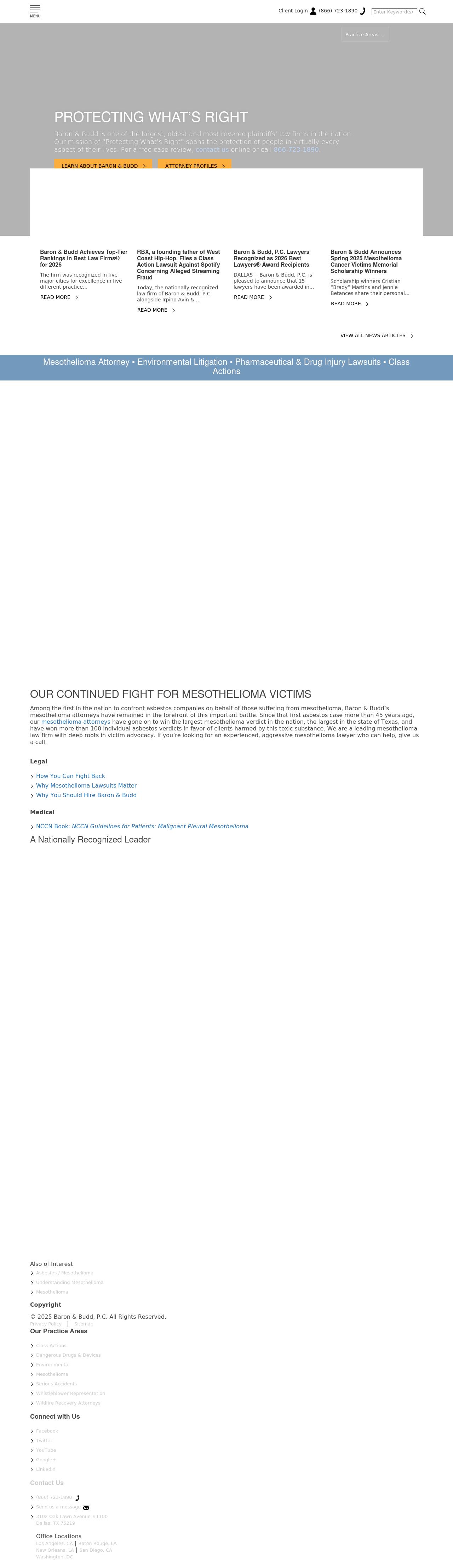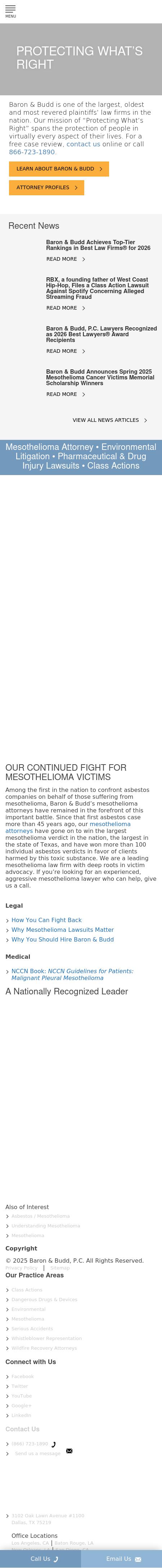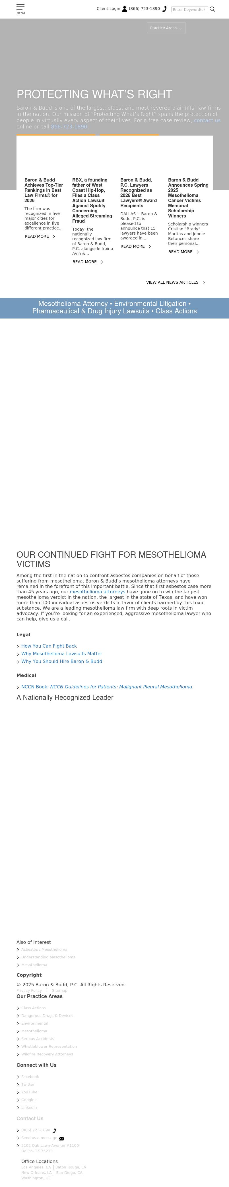 Baron & Budd, P.C. Baron & Budd - National Plaintiffs' Law Firm & Trial Lawyers A national plaintiffs' law firm active in litigating cases including mesothelioma lawsuits, pharmaceutical, class actions and environmental contamination.