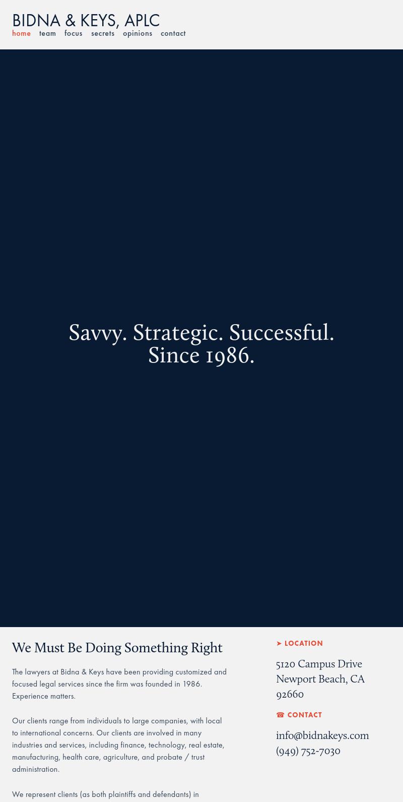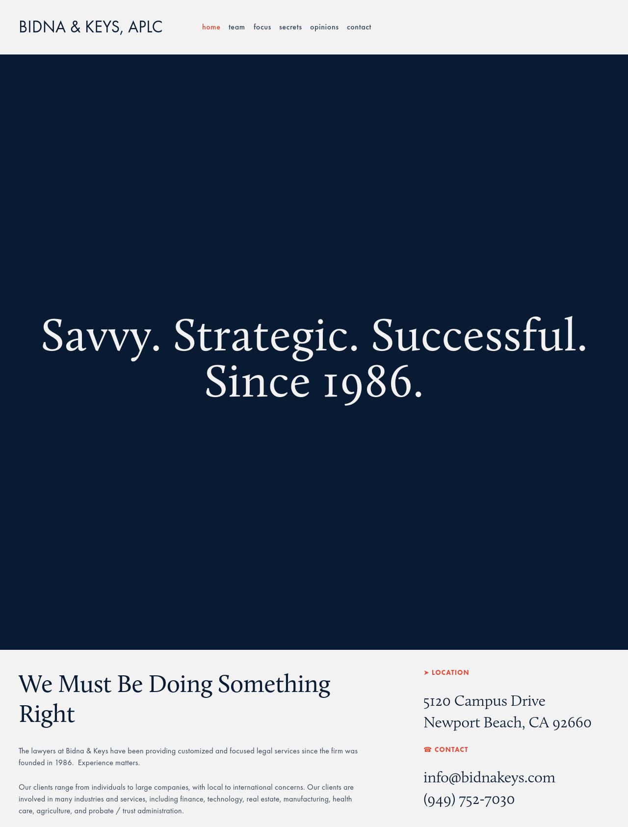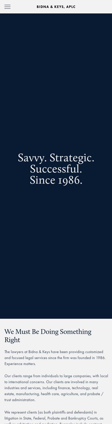 Bidna & Keys APLC Attorneys Bidna & Keys APLC Newport Beach California CA Bankruptcy Law Business & Commercial Law Antitrust Law Reorganizations & Restructuring Trade Secrets Lawyers Our formula for practicing law has served our clients well since we founded Bidna & Keys in 1986; we are all experienced attorneys, who treat each matter with personal attention and sensitivity to the cost of legal services.