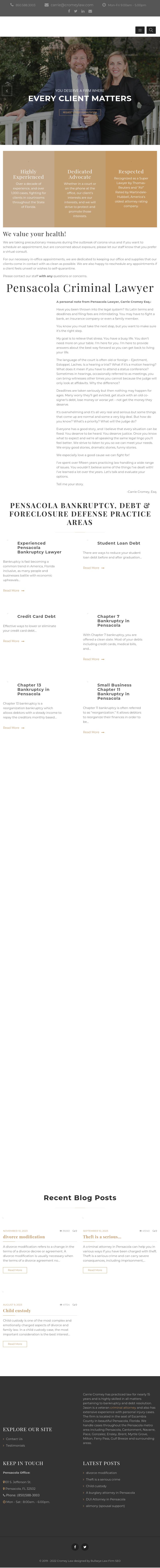 Carrie began her legal career at the Legal Aid Society of Palm Beach County handling a high-volume case load and going to court frequently to serve indigent individuals Carrie and her husband later relocated to Pensacola to be near family where she joined her father in his Alabama law practice, assisting consumers as a Pensacola bankruptcy lawyer, personal injury & foreclosure attorney and defending against repossessions and evictions and families in evictions, foreclosures, domestic violence injunctions, family law cases, and immigration proceedings.