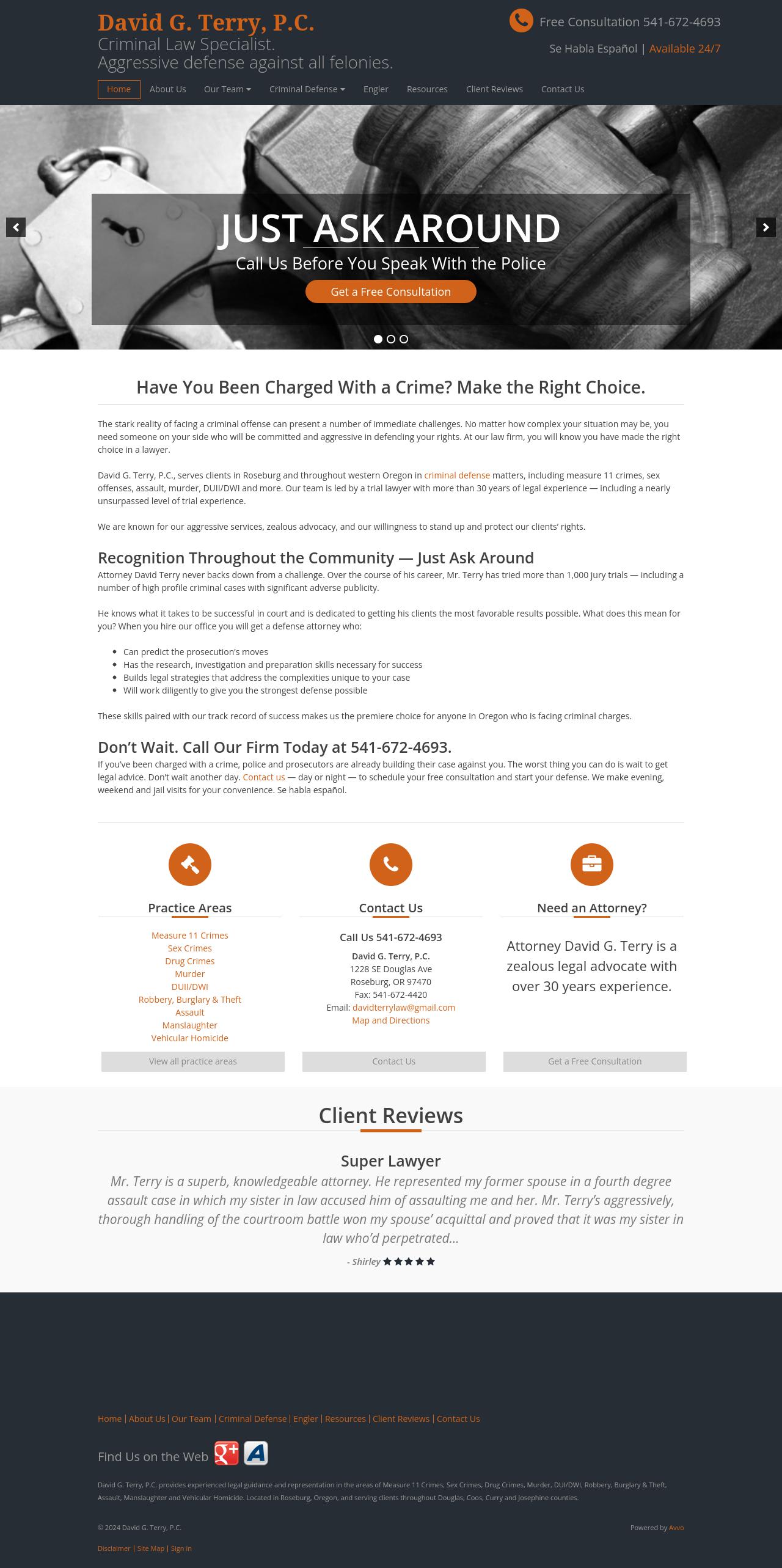David G. Terry, P.C. Roseburg Criminal Law Attorney | Oregon DUII/DUI/DWI Lawyer | Douglas County White Collar Crime Attorney OR Charged with a crime? We will fight your charges. For an aggressive, effective defense, call attorney David Terry at 541-236-2562.