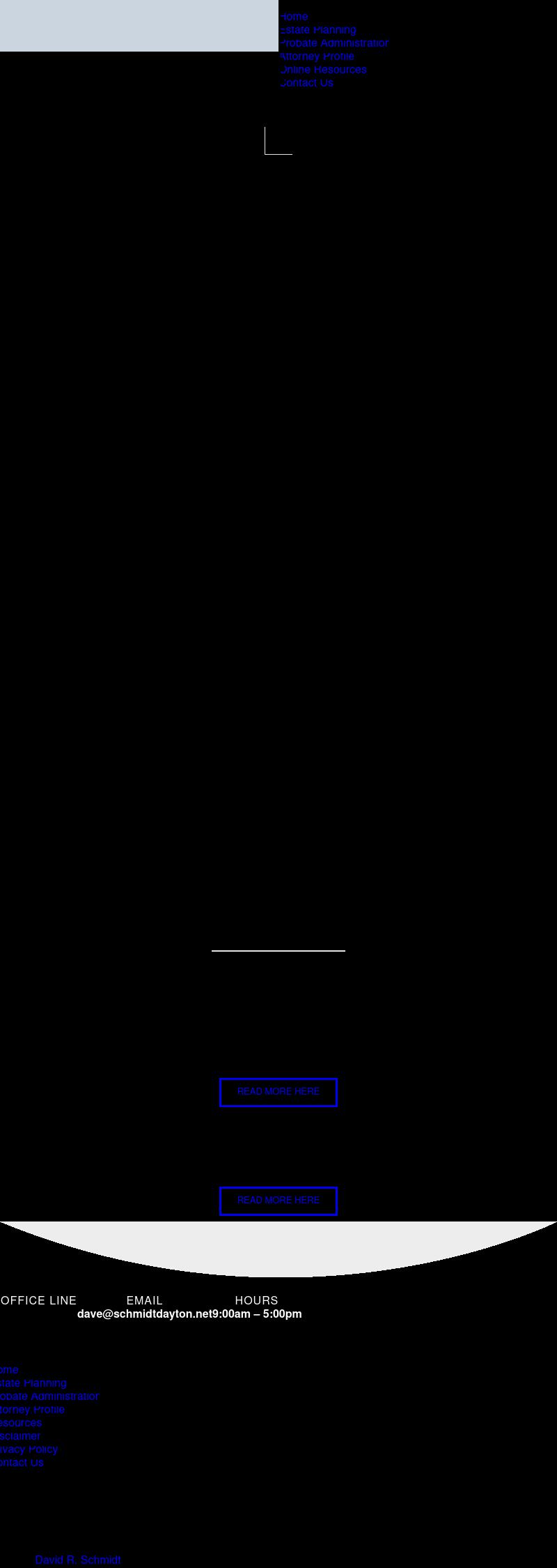 David R. Schmidt Dayton Ohio Probate Administration Lawyer Estate Planning Attorney Guardianships OH At David R. Schmidt, Attorney at Law, we help clients with probate administration and estate planning, wills, trusts, powers of attorney, health care powers of attorney, guardianships, and mental illness matters. Contact us today at our office in Dayton, Ohio.