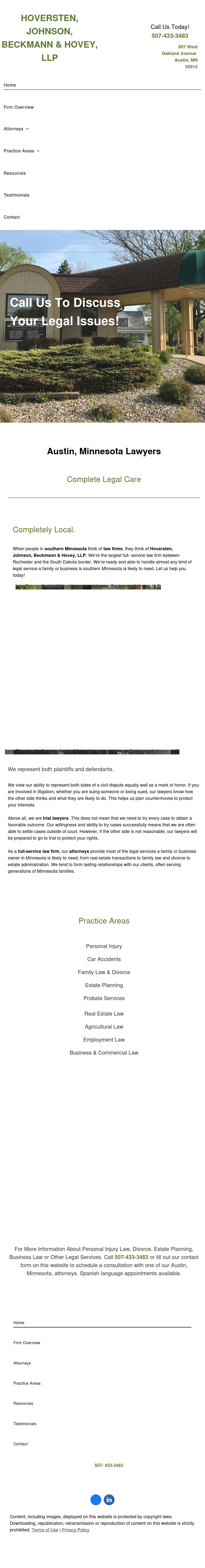 Hoversten, Johnson, Beckmann & Hovey, LLP Austin MN Attorney | Albert Lea Personal Injury Lawyers | Minnesota Family Law Firm Need legal help? Call 507-396-4891 to reach an attorney at Hoversten, Johnson, Beckmann & Hovey, LLP, in Austin, Minnesota.