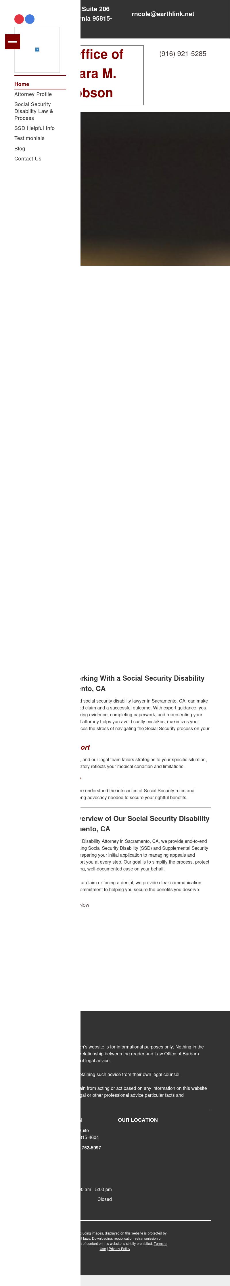 Law Office of Barbara M. Jacobson Sacramento Social Security Disability Attorney | Roseville CA SSI Lawyer | Folsom Disabled Veteran Disabiity Attorney Sacramento Social Security Disability lawyer Barbara M. Jacobson provides skilled representation in disability claims. Call our firm at 916-921-5285.