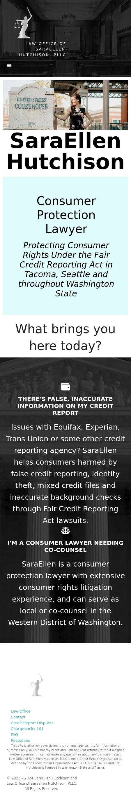 Law Office of SaraEllen Hutchison, PLLC Seattle Consumer Protection Lawyer | Credit Report Have credit report errors taken over your life? Stop the nonsense. I am SaraEllen Hutchison and I can bring the fight to the credit company. Call 888-339-3942.