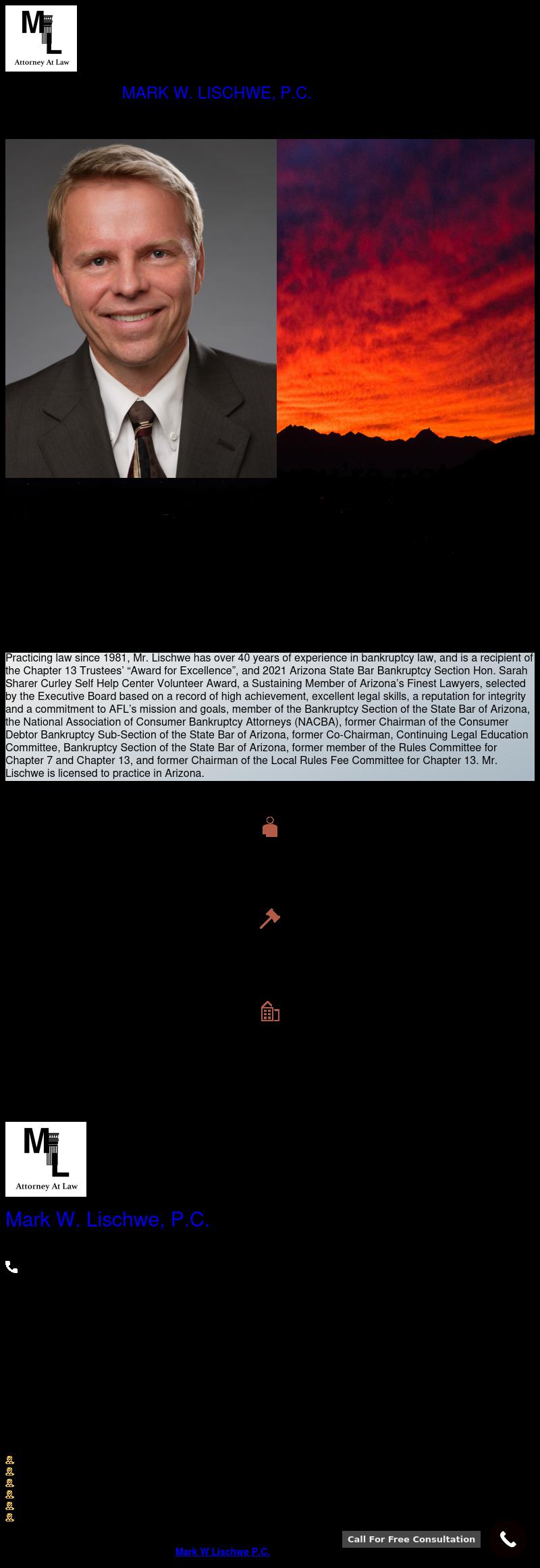 Mark W. Lischwe, P.C. Phoenix Arizona Bankruptcy Attorney | AZ Chapter 7 & 13 Home Foreclosure Lawyer Mesa Attorney Mark W. Lischwe, P.C., represents clients throughout Phoenix, Arizona, in Chapter 7 and Chapter 13 bankruptcy. Call 602-252-7466.