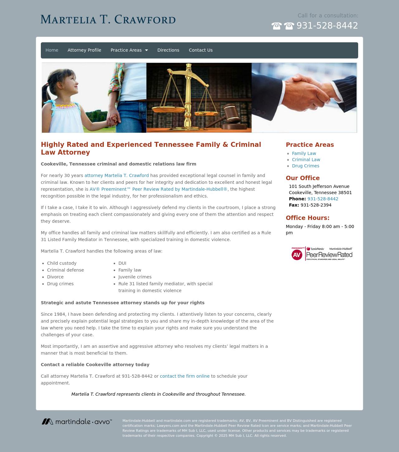 Martelia T. Crawford Martelia T. Crawford - Cookeville, Tennessee Family, Criminal, Drug Crimes Attorney | Martelia T. Crawford The Cookeville, Tennessee family, criminal and drug crimes lawyer Martelia T. Crawford serves clients in Cookeville and throughout Tennessee.