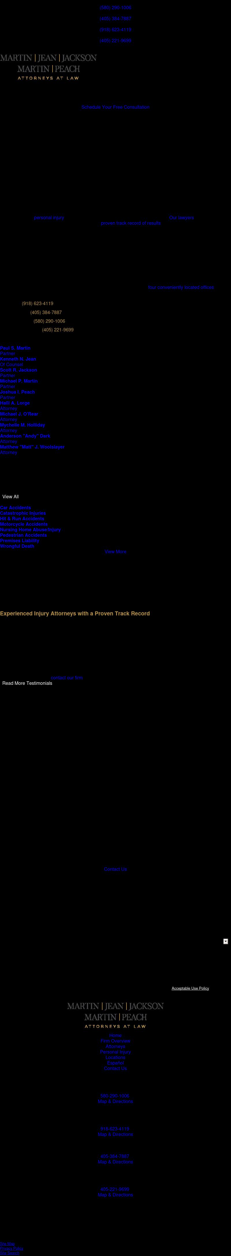 Martin Jean & Jackson maintains offices in Ponca City,Stillwater, and Tulsa, serving clients throughout the state. Their Oklahomapersonal injury attorneys have more than 100 years of experience between them,and pursue maximum compensation for clients with aggressive zeal. The team hasa long history of obtaining multi-million dollar settlements and verdicts.Every partner of the firm is a member of the Million Dollar Advocates Forum orMulti-Million Dollar Advocates Forum, prestigious organizations in which lessthan 1% of attorneys across the country hold membership.
