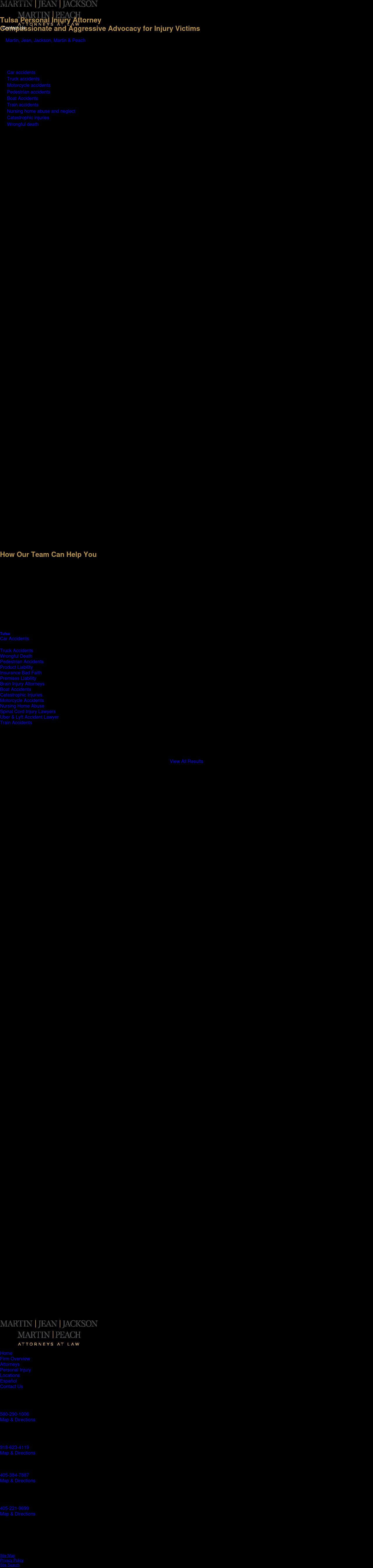 The Oklahoma personal injury attorneys at Martin Jean &Jackson aggressively fight for maximum results on behalf of their clients. Theteam understands that injury victims often feel out of control, which can be avery frustrating experience. Their work gives clients an opportunity to retakethe reigns of their life by forcing the people responsible for the accident totake accountability, and possibly receiving compensation that can go a long wayin aiding their recovery. Every partner at the firm is a member of the MillionDollar Advocates Forum or Multi-Million Dollar Advocates Forum, prestigiouslegal institutions consisting of less than 1% of attorneys across the nationwho have obtained more than a million dollars for clients through a singlesettlement or trial verdict. Martin Jean & Jackson operates on acontingency fee basis, meaning clients pay no attorney fees unless they seeresults from their case. Call today and schedule a free consultation with theteam to learn more about your rights after an accident.