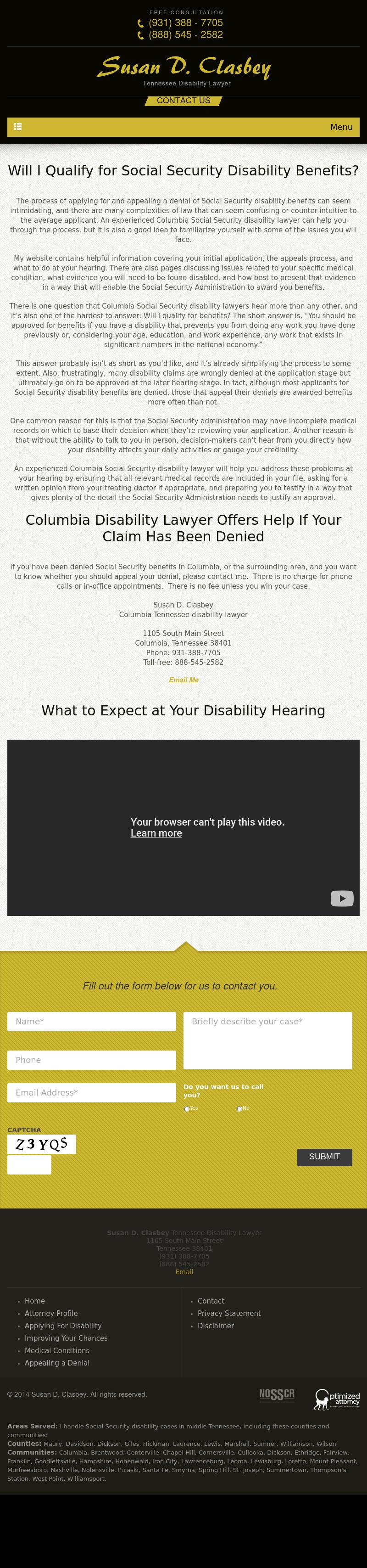 Susan D. Clasbey Columbia Social Security Disability Lawyer | Susan Clasbey If you have been denied Social Security disability benefits in Nashville, Columbia, or the surrounding area, call our disability Lawyer at (931) 388 - 7705