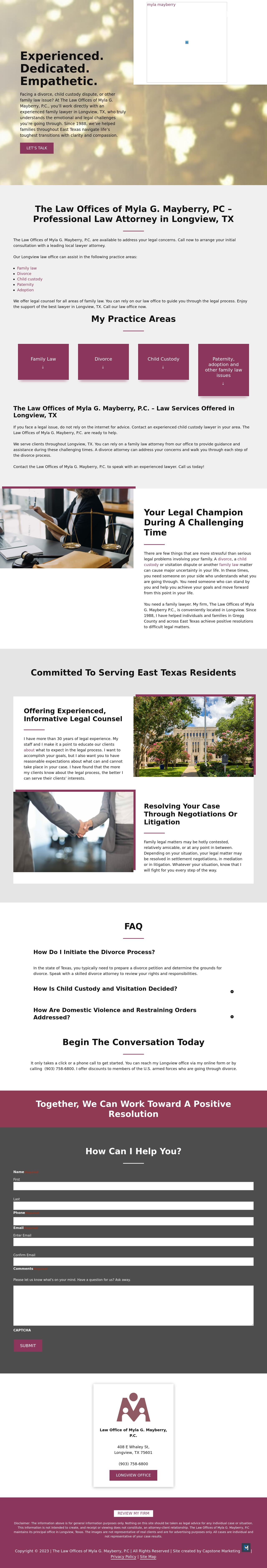 The Law Offices of Myla G. Mayberry, P.C. Longview Divorce & Family Law Lawyer | Tyler Child Custody Attorney | East Texas Visitation Dispute Law Firm Longview lawyer Myla Mayberry serves clients across east Texas in a wide range of family law matters. Call an attorney at 903-331-0782.
