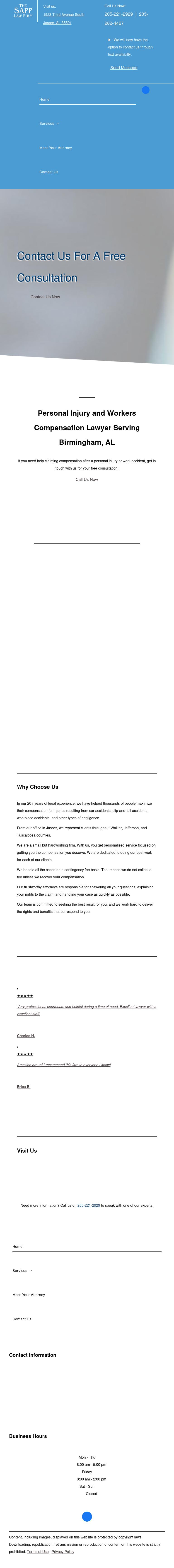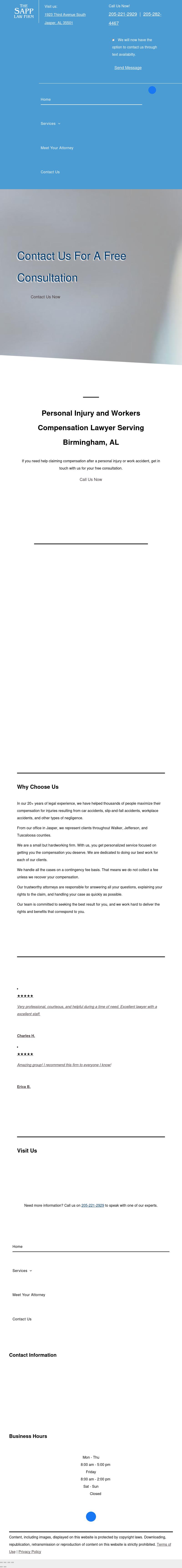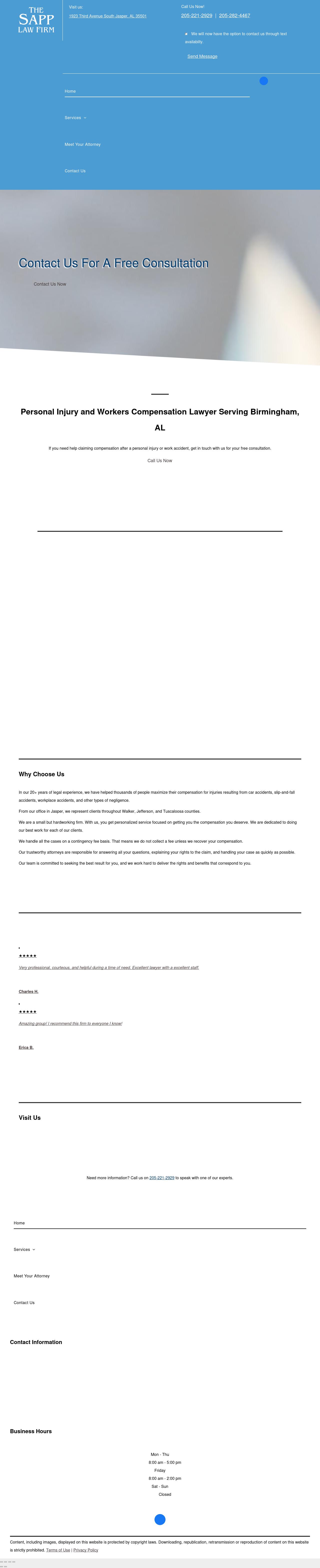 The Sapp Law Firm, L.L.C. Jasper Personal Injury Lawyer | Birmingham AL Workers Compensation Attorney | Walker County The Sapp Law Firm: Jasper personal injury lawyer dedicated to full and fair compensation. Free consultation: 205-282-4467.
