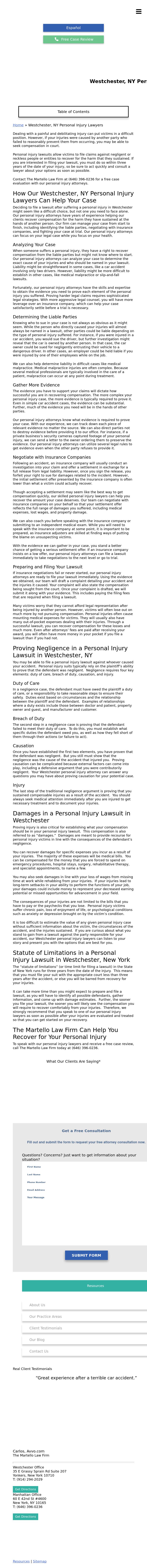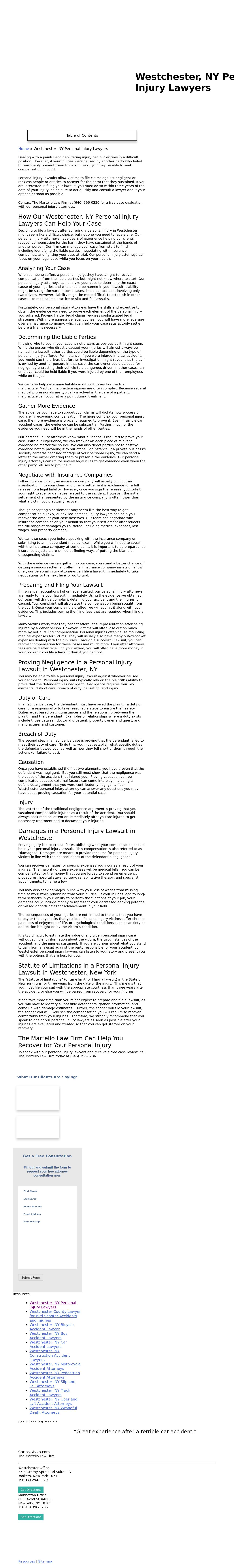 The Martello Law Firm Yonkers Car Accident Lawyer The aftermath of a car accident in Westchester can strain a victim’s physical, emotional, and financial health. Filing an accident claim should not add to that stress. Talk to one of the experienced Westchester car accident lawyers at The Martello Law Firm, and they will guide you on how to be properly compensated for your incident.
